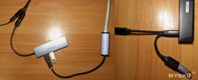 Для подключения внешних устройств к стику, нужен кабель-адаптер, который подключается по USB-C к стику, а с двух других сторон подключается питание и внешние устройства: флешки, ethernet-адаптеры, клавиатуры-мыши (если в этом конечно есть необходимость). Это работает и с USB-хабами. Так же есть OTG-хабы, в которых сразу реализовано несколько портов и вход питания. Но здесь важно понимать, что комплектный адаптер на 5W. Для флешки этого хватает, но если мы хотим подключать внешний диск 2.5' или ethernet-адаптер, то стоит подумать о другом, более мощном адаптере питания. Так же важно понимать, что порт USB 2.0, который в теории имеет скорость 480мбит/сек, а на практике — порядка 300мбит/сек (38 мегабайт). К слову, для внешнего диска — этого более, чем достаточно.