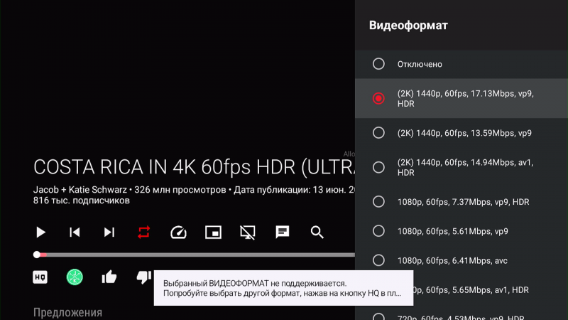 Разрешения, выше Full HD, плеер не позволят воспроизводить, выводя сообщение об этом (на этом моменте тоже остановлюсь в выводах).
