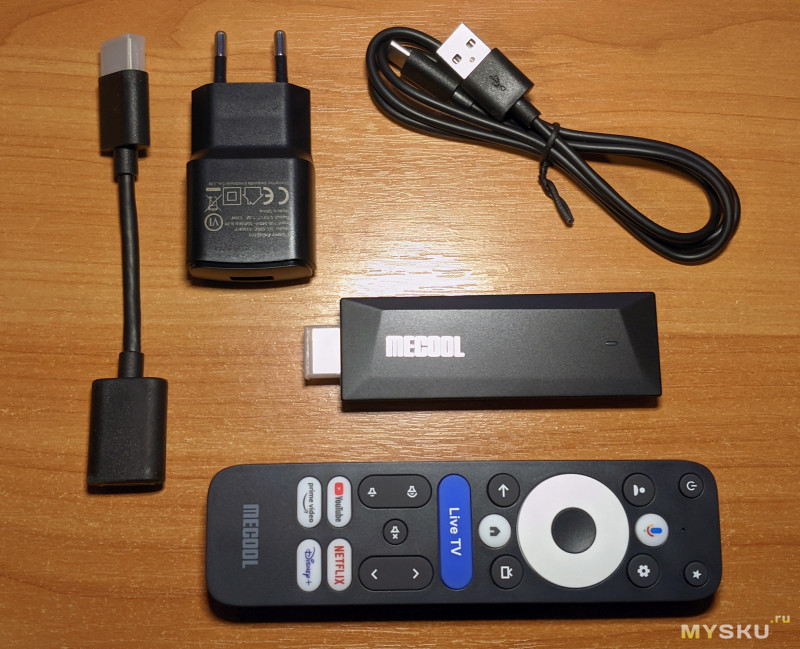 Комплектация: тв-стик, пульт, адаптер питания (USB 5W, потребление стиком — порядка 0.5-1.5W), удлинитель HDMI, для фиксации за телевизором на стене и кабель USB A-C.