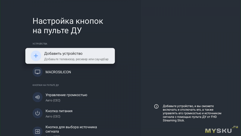 Пульт — немного отличается от того, который был в 4K-модели, наличием большой синей кнопки Live-TV, которая назначается на любое, из установленных на стике — приложений. В остальном он идентичный, очень удобный и удачный. У него основные элементы навигационного управления — контрастно-белые, их хорошо видно даже в условии плохого освещения. Ну и конечно есть «инфракрасный бластер», который позволит включать и выключать ваш телевизор и пользоваться тв-стиком посредством одного пульта. Первый раз я столкнулся с подобным решением в тв-стике от Amazon и с тех пор, лично для меня — эта функция «маст-хэв». Ну и HDMI-CEC, разумеется, тоже присутствует. Настройки — очень гибкие.
