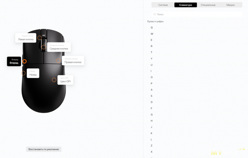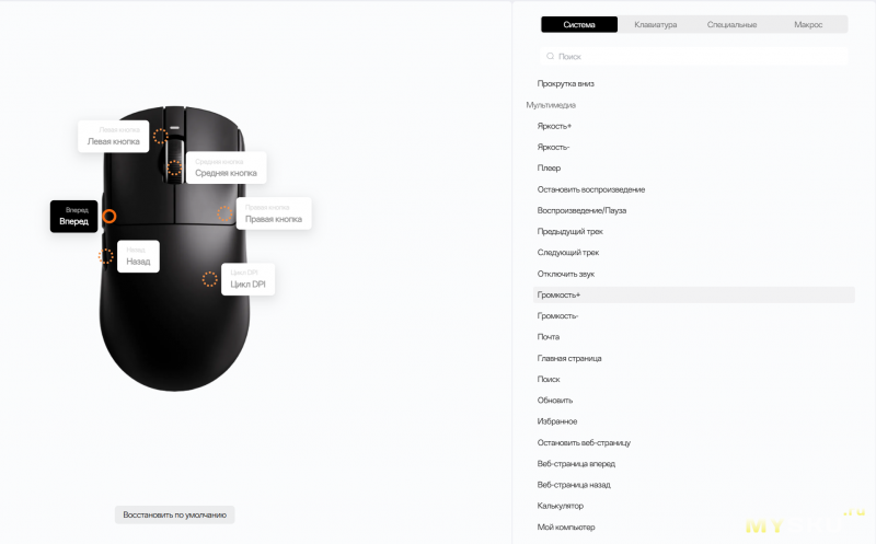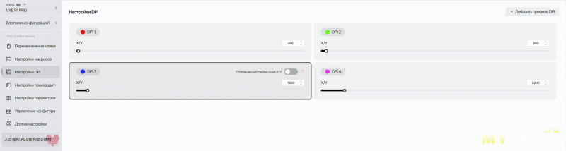 Настройка DPI позволяет установить четыре пресета. По умолчанию, их переключение происходит кнопкой возле сенсора, под мышью.