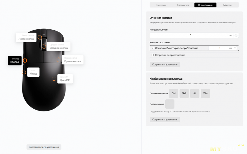 Все настройки — сохраняются в саму мышь и можно записать до четырёх конфигурации, под разные сценарии использования или разные игры. И кстати, переключать конфигурации можно не только из ПО, но и самой мышью (если назначить на это одну из кнопок, логично — ту, которая под мышью).