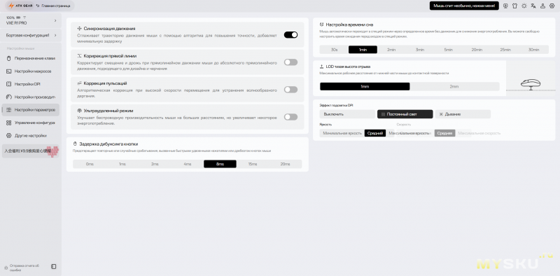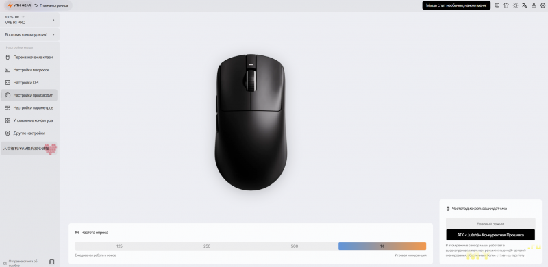 Меню «производительность» позволяет настроить баланс между энергопотреблением и производительностью. Можно выбрать частоту дискретизации датчика — «базовый режим», который экономит батарею мыши и рассчитан на повседневную офисную работу, либо ATK «Juesha», который рассчитан на работу в высокопроизводительном режиме с высокой частотой сканирования, что обеспечивает более отзывчивую работу и следовательно дает преимущество в игре.