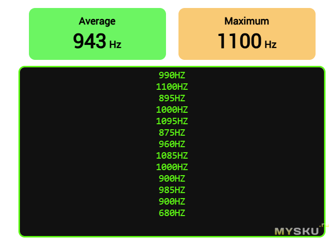 Проверил и частоту опроса. В режиме 1000 Гц мышь честно выдает в среднем 940–950 Гц, с адекватными всплесками на резких движениях. Связь держит уверенно, «провалов» частоты я не заметил.