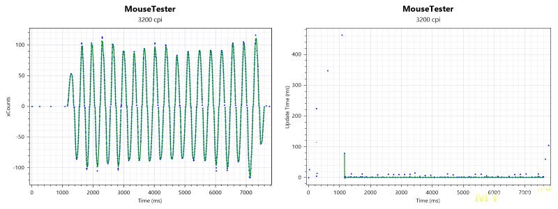 - Линейные тесты (1600 и 3200 CPI): Синусоида ровная, пики одинаковой высоты. Это говорит о том, что при быстрых движениях влево-вправо сенсор ведет себя предсказуемо.