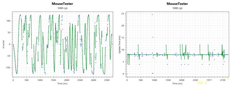 Первые два теста — резкие движения мыши влево-вправо (1600 и 3200 CPI). Третий тест — резкие круговые движения.
