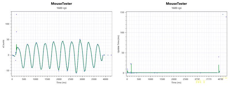 - Плотность точек: Синие точки (реальные отчеты сенсора) практически идеально лежат на зеленой линии (расчетная траектория). Это значит, что мыши нет проблем со срывами или резкими скачками.