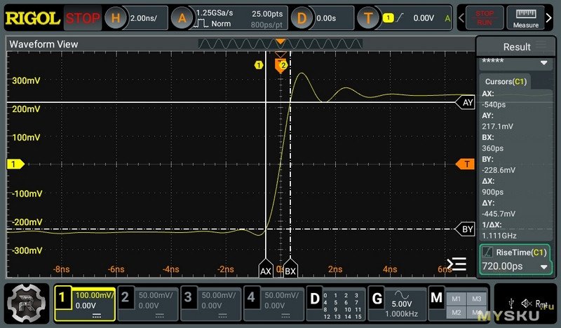 Время нарастания измеренного меандра уменьшилось с 1,3 нс до 720 пс.