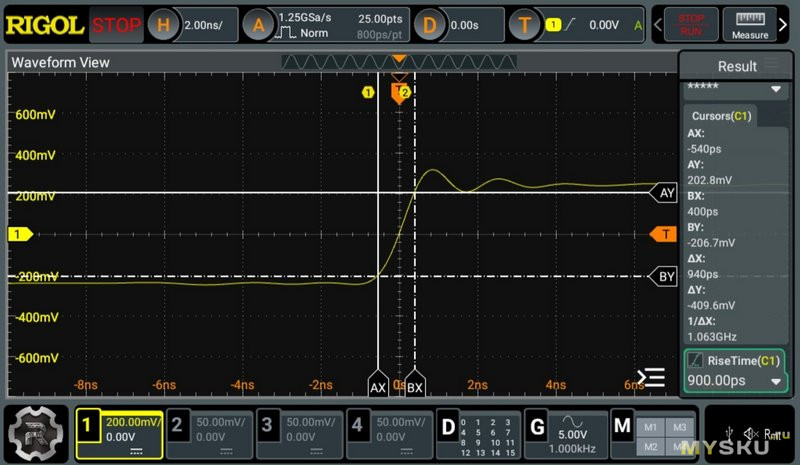 Мне сложно сказать точное время нарастания, так как мой генератор имеет небольшое фазовое дрожание и время нарастания может колебаться от 700 до 900, но если смотреть сигнал из памяти, то стабильно 720-750