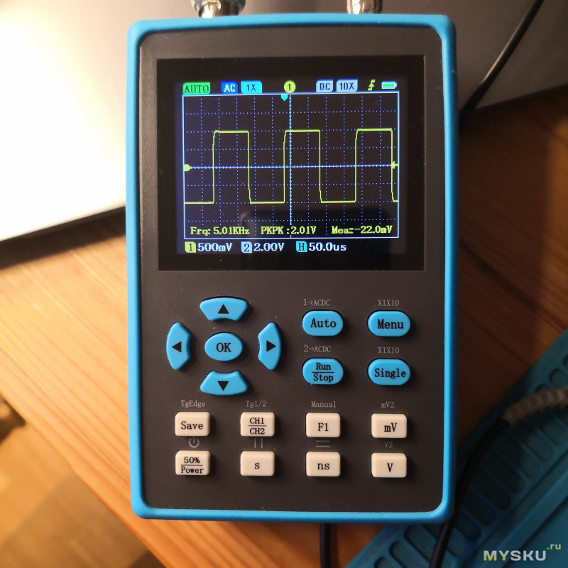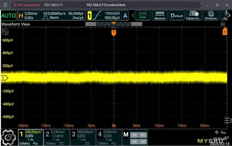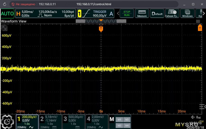 И самое важное, при входе нагруженном на резистор 50 Ом, и использовании оригинального блока питания, идущего в комплекте с осциллографом, уровень шумов низкий, нареканий о которых писали на форумах, не наблюдается.