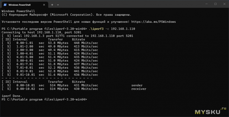 Для подключения к сети доступно два интерфейса — Ethernet 100M и Wi-Fi 6. В комнате с роутером скорость соединения составила порядка 430 Мбит/сек.