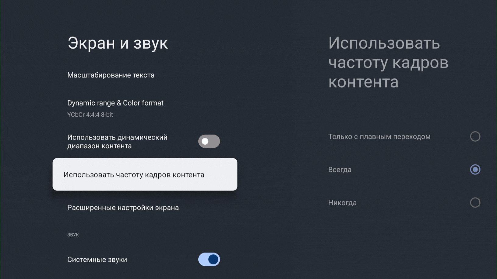 Меню стандартное для оболочки Google TV, включает исчерпывающее количество настроек, включая автофреймрейт и конвертацию DV и HDR в SDR.