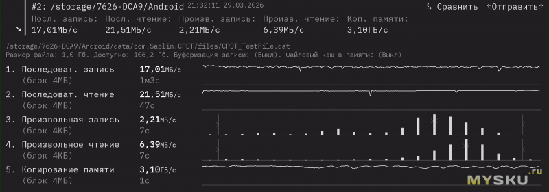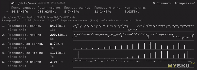 eMMC. Чтение: 200,6 Мб/с, запись: 84,8 Мб/с.