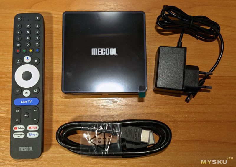 Комплект: приставка, кабель HDMI, пульт и адаптер питания (12V 1A).