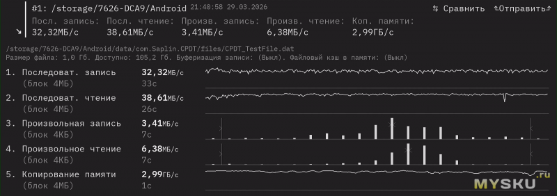 Та же SD-карточка в кардридере и слоте USB. Чтение: 38,6 Мб/с, запись: 32,3 Мб/с.