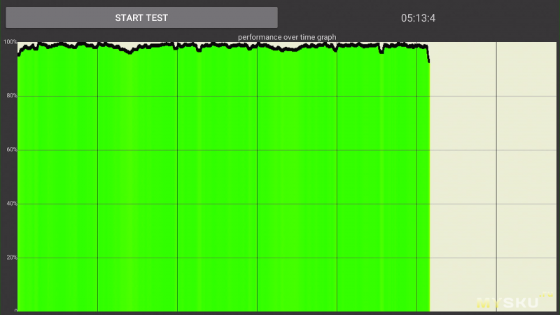 Стресс-тест в течение 5 минут показал, что частоту процессор держит стабильно. Нагрев корпуса составил 41.2°C сверху и 36.2°C снизу. В режиме обычной эксплуатации (просмотр видео) устройство остается чуть теплее комнатной температуры.