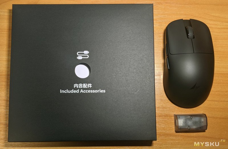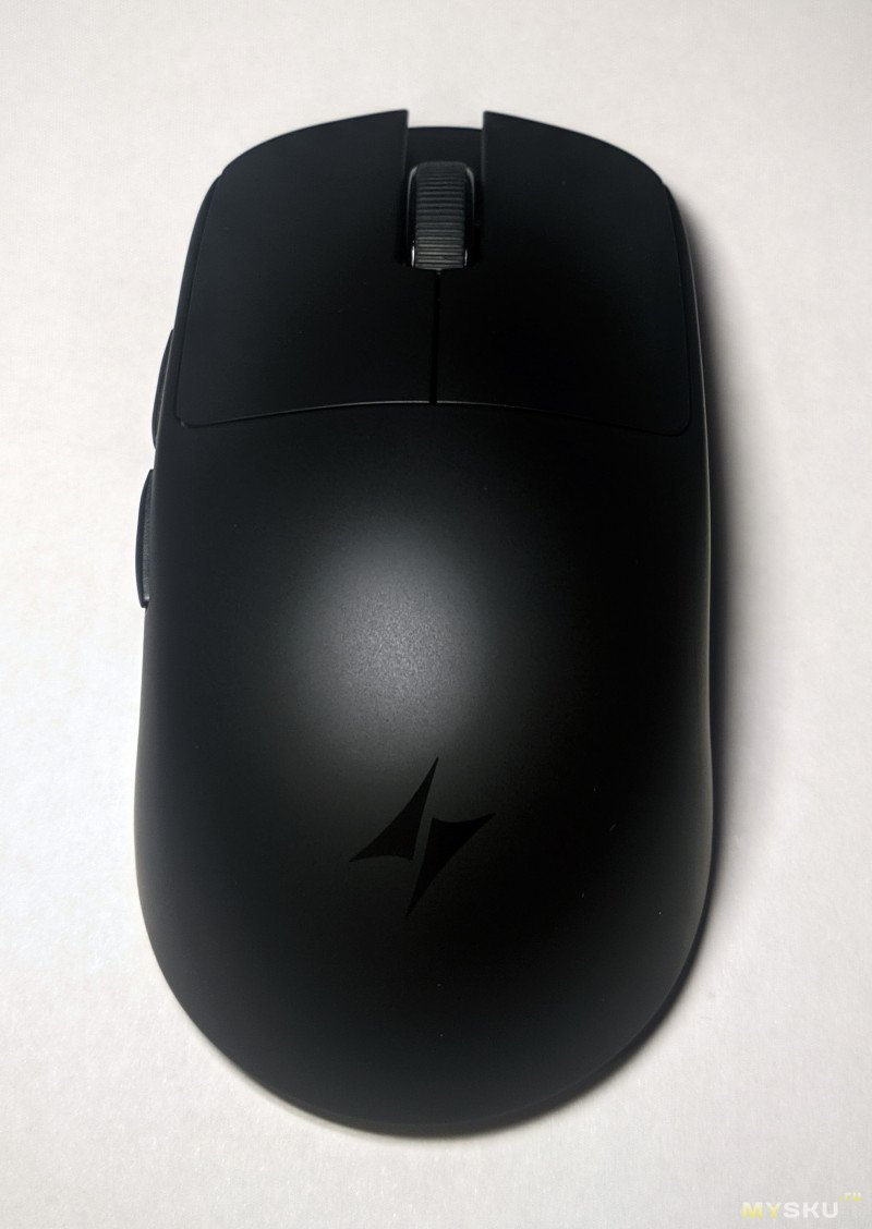 Мышь имеет уже ставшую классической, выраженную анатомическую форму с низким передом и высокой спинкой. Прообразом для дизайна таких мышей (по моему мнению) стала Logitech G Pro X Superlight. Впоследствии многие производители взяли такой вид корпуса за эталон и стали его модифицировать. В целом, учитывая сегодняшнее предложение на рынке, такая форма хорошо себя зарекомендовала. Эта геометрия корпуса отличается от классических компактных офисных мышек, на неё рука ложится немного иначе — ладонь получает больше поддержки. Если мышь R1 Pro казалась невесомой, то эта — будто вообще пустая внутри. Это очень необычно ощущается после мыши с АА-батарейкой, где только вес батарейки, наверное, сопоставим с половиной веса этой мыши.