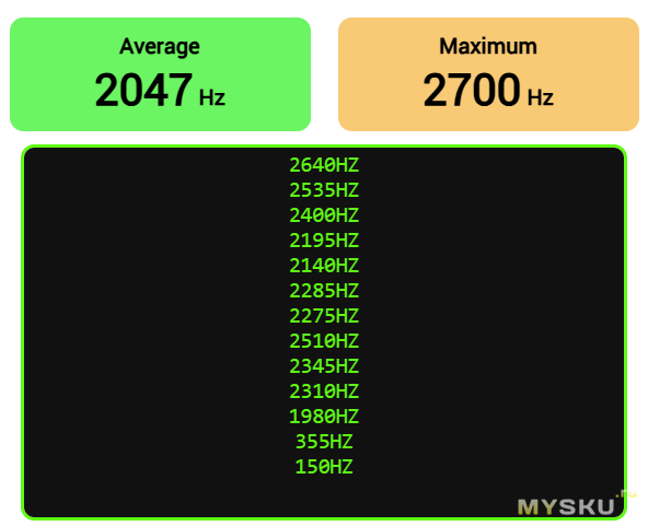 При включённых 8K частота «гуляет» в районе 2200–2600 Гц.