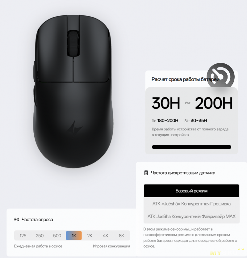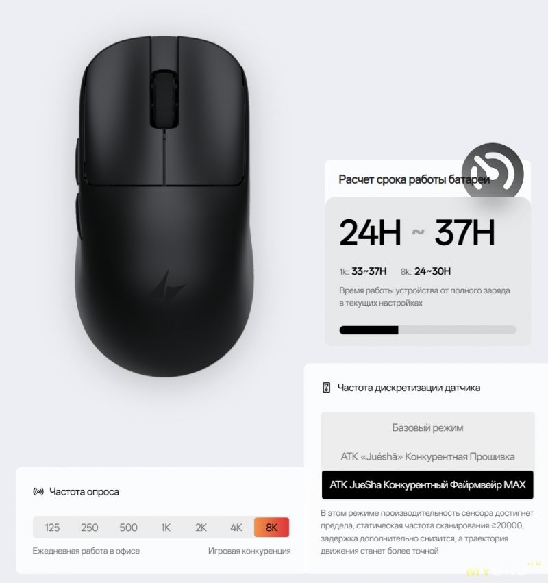 Внутри стоит топовый PAW 3950 Ultra. Для 8000 Гц нужна не только мышь с её поддержкой, но и мощный современный игровой компьютер. ATK на своём сайте указывают системные требования: Intel Core i7-9700K и новее или Ryzen 7 3700X и новее, дисплей с развёрткой 240 Гц, NVIDIA GTX 1080 и выше или AMD RX 5700 и выше и 16 ГБ ОЗУ. У меня же довольно старенький Ivy Bridge 3770K и графика RX 580. Соответственно, протестировать её на всю мощность у меня просто нет ресурсов.