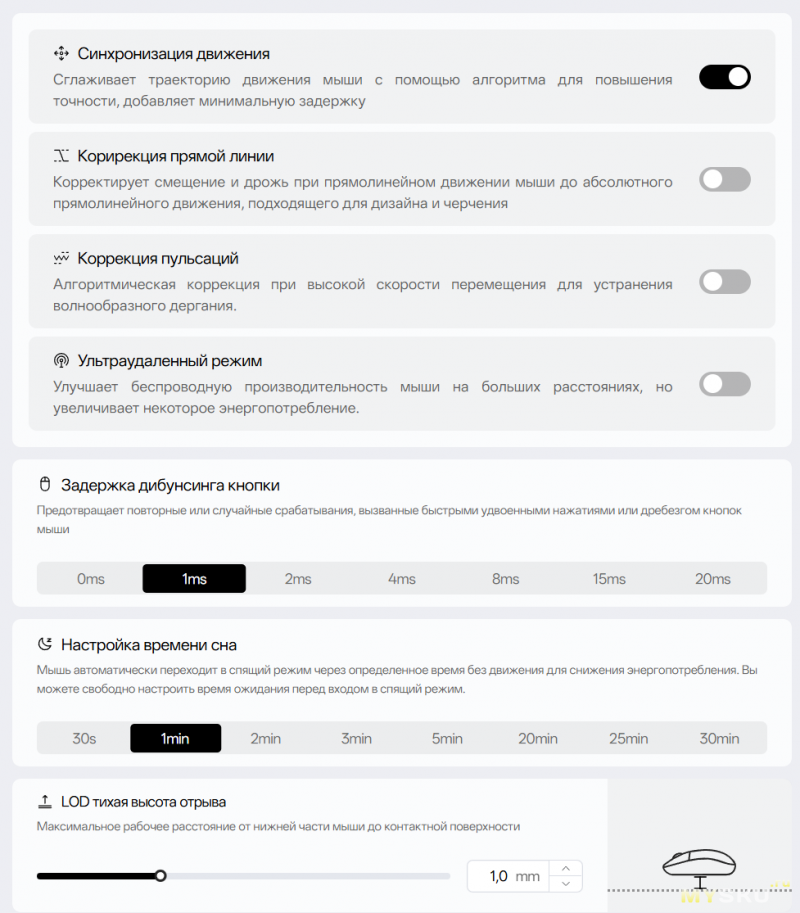 - Производительность: Здесь настраивается частота опроса. В комплекте идет донгл на 8000 Гц. Для офиса это, конечно, избыточно (быстрее сажает батарею), но для киберспорта — ТОП.