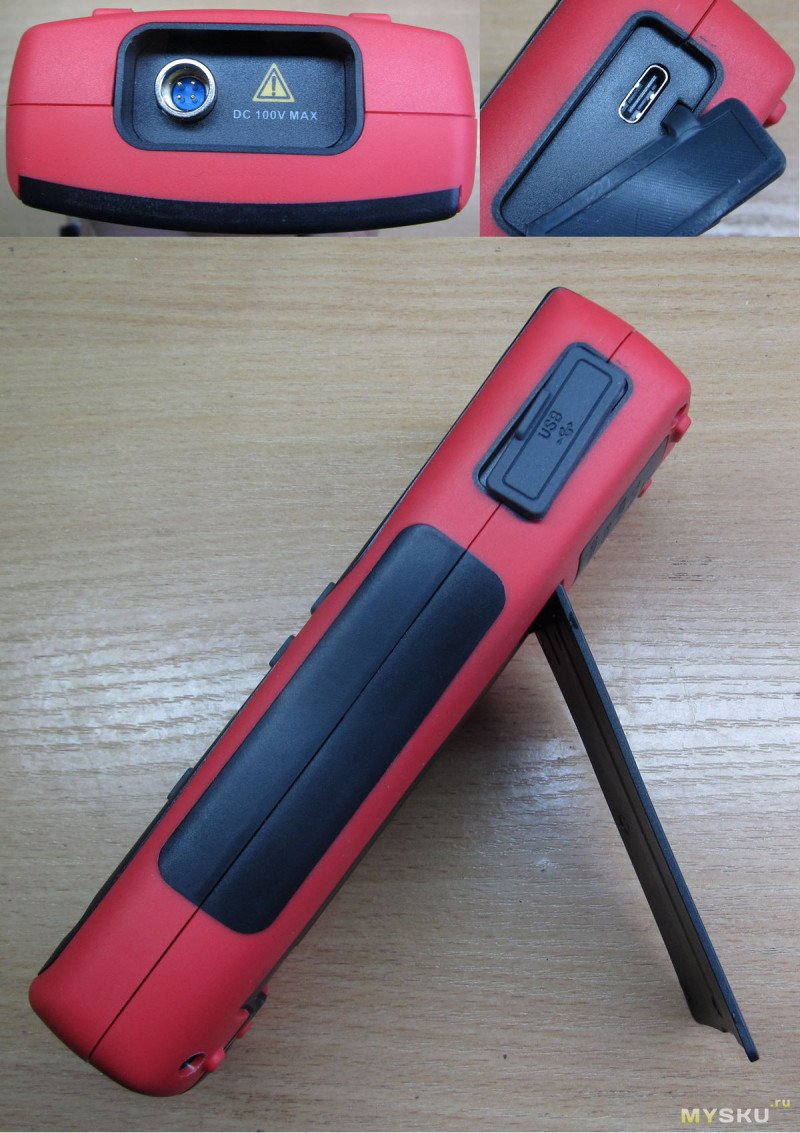 Ну и сам прибор. Это однозначно красавец. Собран в корпусе, который уже знаком нам по 702 и 703 осциллографам-мультиметрам. На правой грани разъем type-c, на верхней — разъем для Кельвинов для измерения батарей