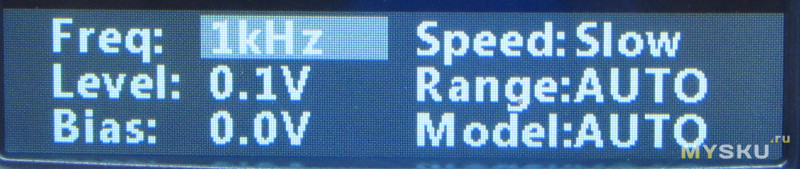 В нижней части экрана присутствует индикация текущих настроек, задаваемых вышеприведенными кнопками. По этим параметрам можно переходить и изменять их курсорными кнопками. Кроме частоты, уровня, скорости и модели тут также присутствуют BIAS (смещение) — 0 либо 0.5В (при 0.5В уровень проверочного сигнала ограничивается до 0.1/0.3В, 0.6В уже низя), и RANGE, которая переключает диапазон непонятно чего — AUTO/100Ω/1kΩ/10kΩ/100kΩ (да, именно омы/кОмы независимо от режима работы)