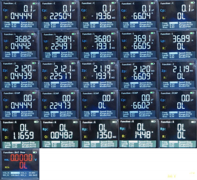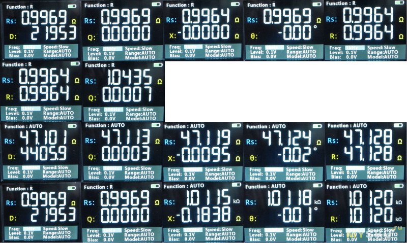Кроме основной величины прибор может измерять: D (потери), Q (добротность), X (реактивное сопротивление), θ (сдвиг фазы), R (сопротивление). В режиме измерения батарей конечно же только напряжение и внутреннее сопротивление.