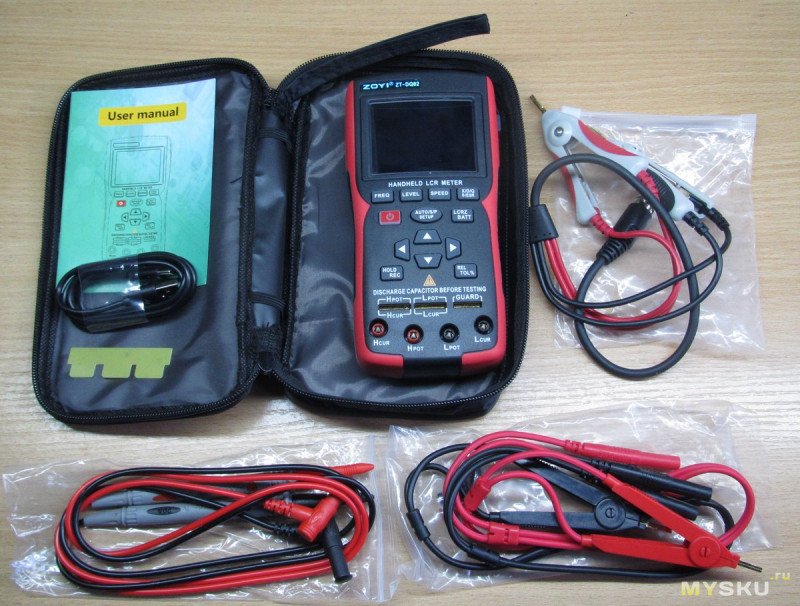 Комплектация: сам прибор, инструкция, щупы обычные, щупы Кельвина с 4*банан, щупы Кельвина с 4-контактным разъемом (как у YR1035+), провод USB-A — type C, текстолитовая пластина- размыкатель ну и всё это в мягкой сумке