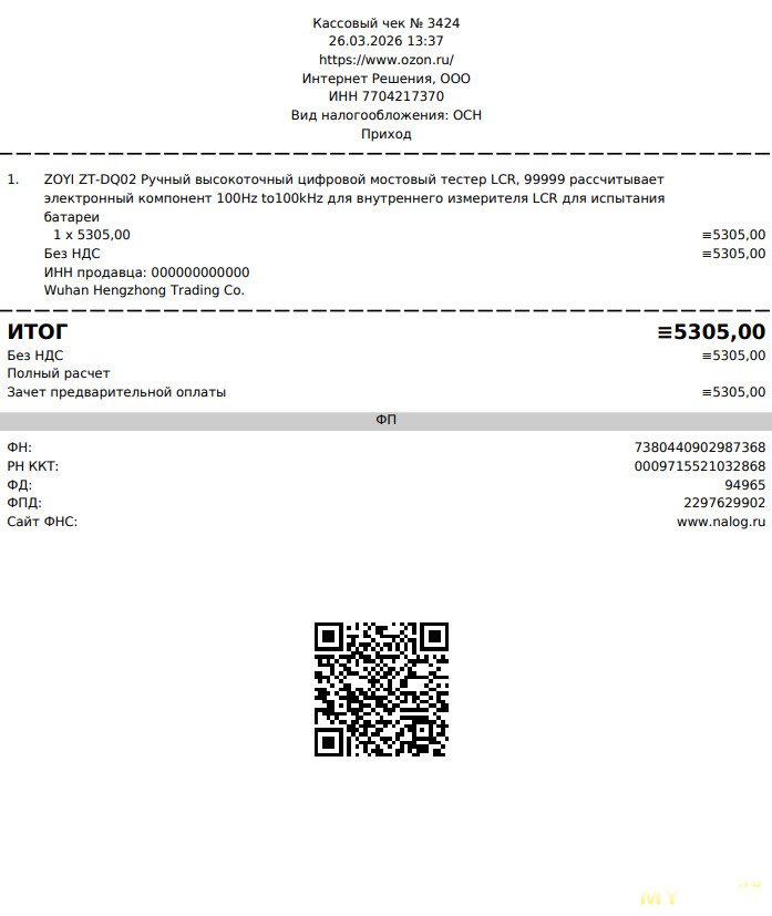 Обошлось, в рублях, 5305, плюс 500 за щупы Кельвина, для измерения RLC (всего — 5805р)