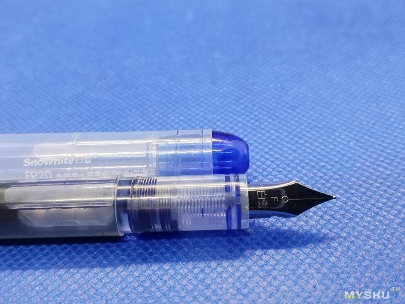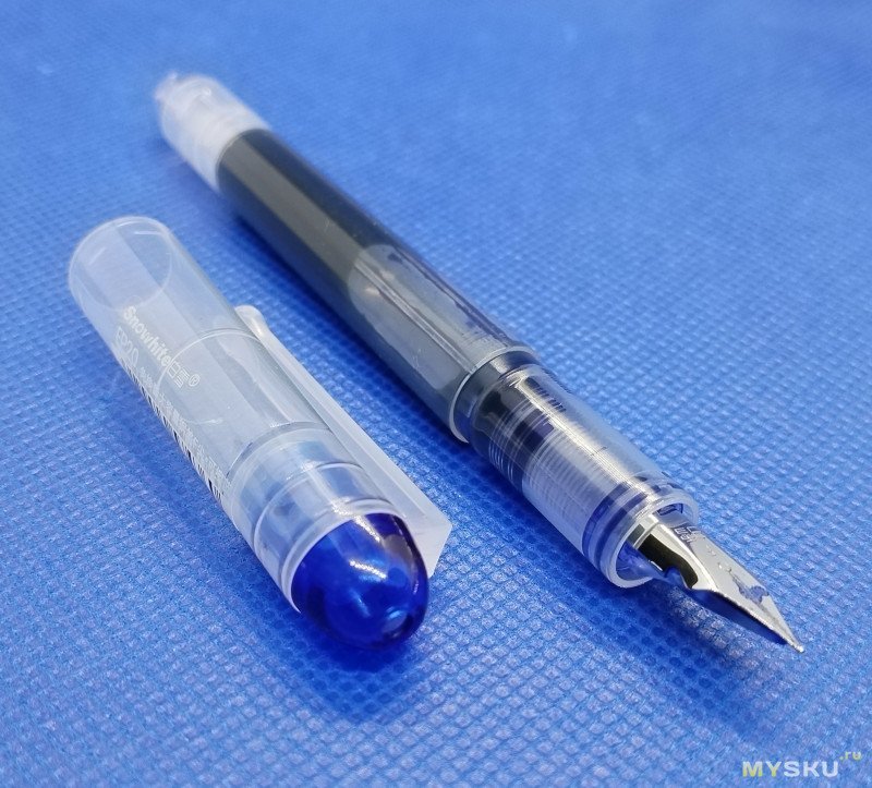 Вот и увидели название самой ручки: Snowhite FP20. Перевод у меня на смартфоне – снежный человек. ИИ подсказывает, что это возможно Белоснежка. Белоснежка – снежный человек? Оригинально…На конце колпачка цветная пластиковая вставка, соответствующая цвету чернил