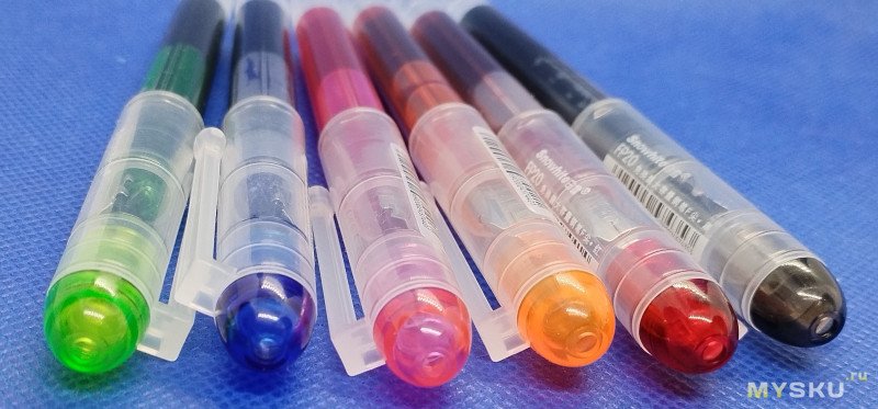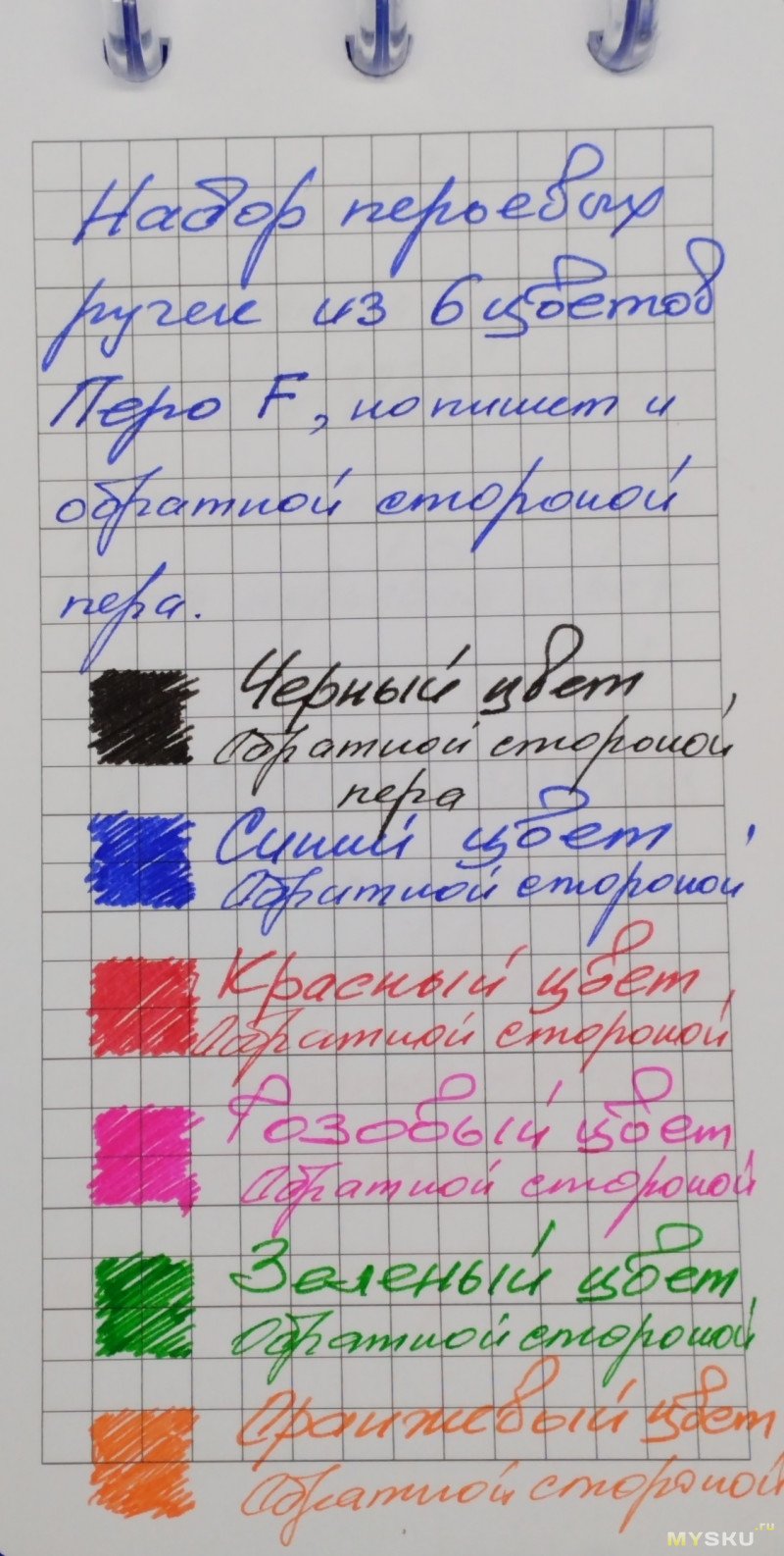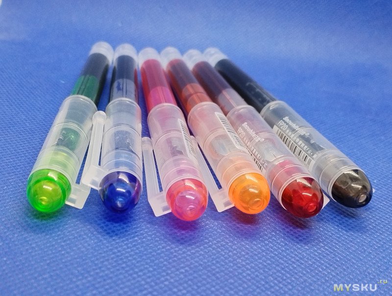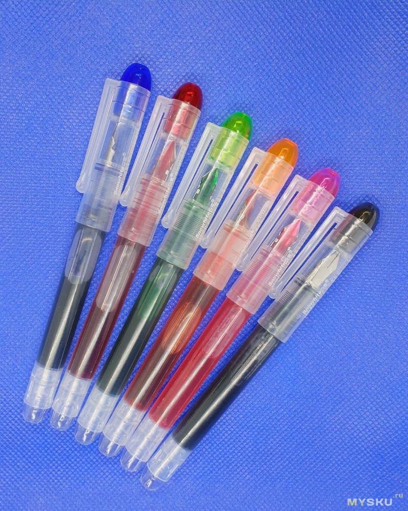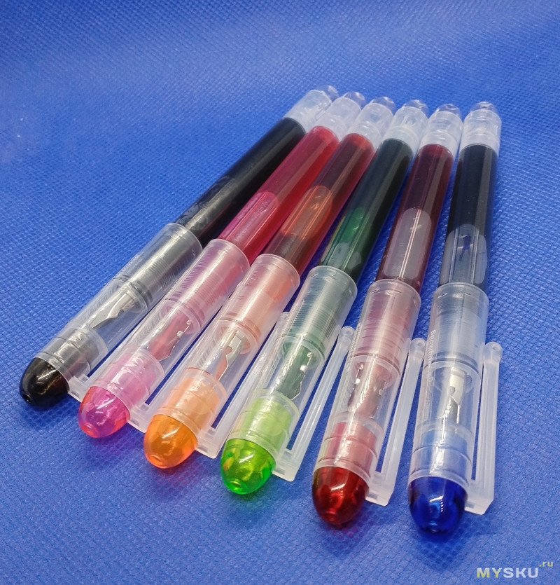 Обратной стороной пера ручки пишут уверенно без пропусков, как обычная ручка с пером EF. Цвета яркие