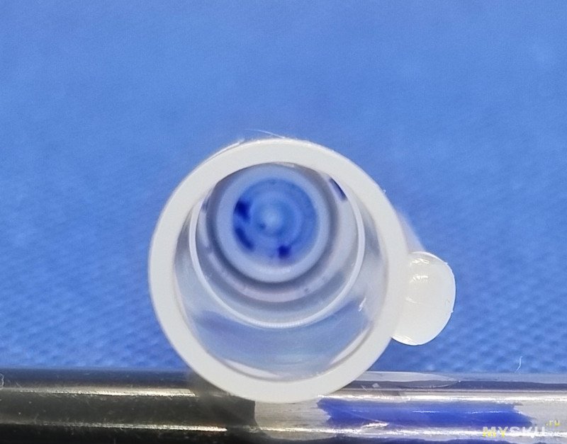На конце колпачка цветная пластиковая вставка, соответствующая цвету чернил