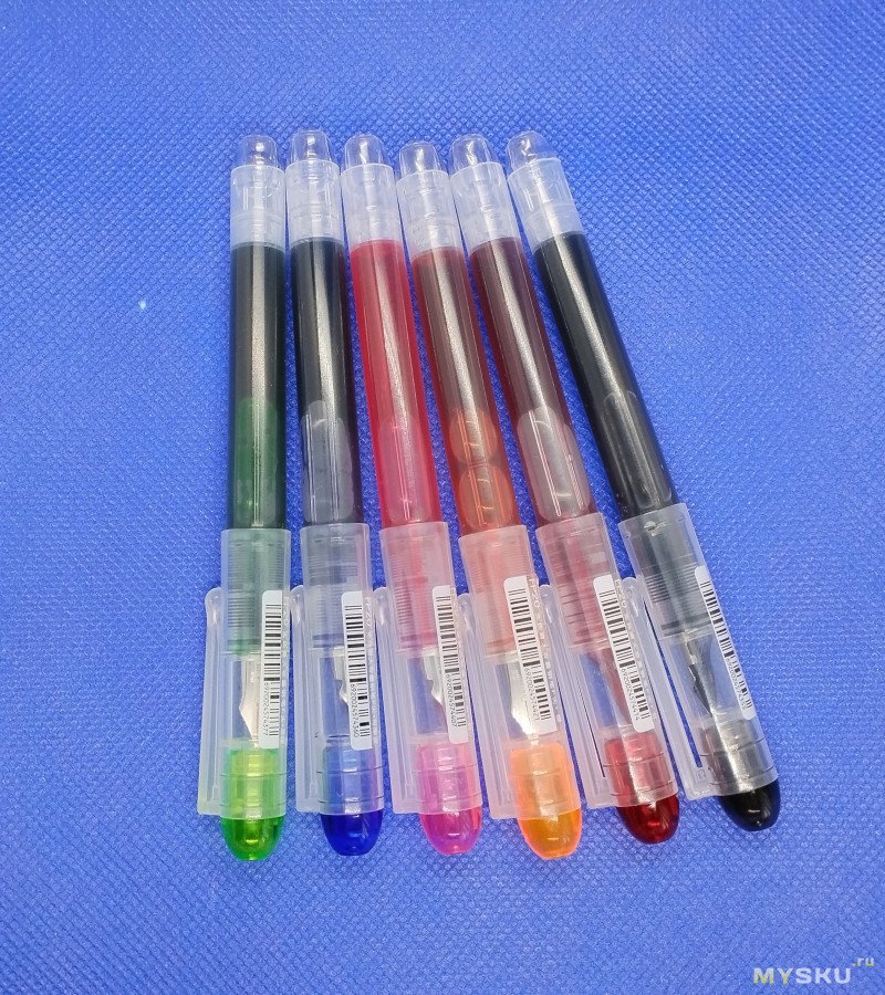 Ну вот они у меня в руках, 6 ручек с разными цветными чернилами стоимостью 30 рублей каждая.