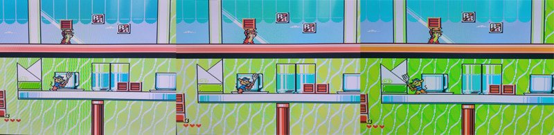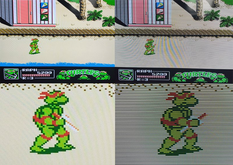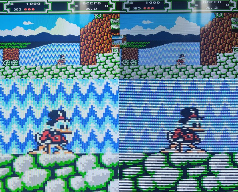 (по клику в большем разрешении)На старых консолях вроде Dendy для вывода четкой, чистой картинки на современные телевизоры понадобится какой-либо продвинутый апскейлер. Была еще Dendy с HDMI выходом, но качество на них было так себе, вероятно использовался слишком дешевый апскейлер, в отличии от этой приставки.