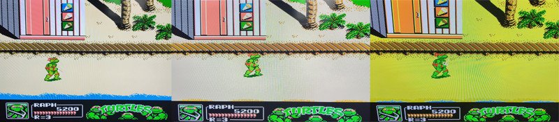 Поддерживается несколько видов палитр, переключаться палитры можно на комбинацию кнопок: Select + Start + Вверх. Есть более сочные палитры вроде Pal/Dendy, есть менее сочные палитры вроде NTSC.