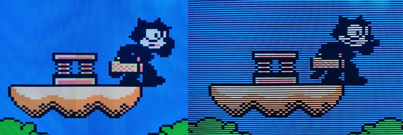 Приставка умеет накладывать сканлайны. С ними изображение становится более тёмным, если они приглянулись по вкусу, то необходимо будет сделать картинку поярче или выводить изображение например, на кинескопные мониторы.