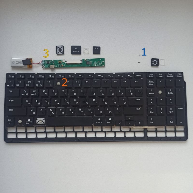 Собрана клава с использованием двустороннего скотча: на аккумуляторе и самой мембране которая крепиться им к металлическому основанию. Сам аккум припаян к плате — фото 3.