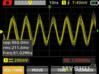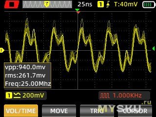 Теперь самое интересное — на что способен осциллограф? Все осциллки в режиме высокой производительности, в одноканальном режиме, впрочем, включение второго канала никак не отражается на форме сигнала.