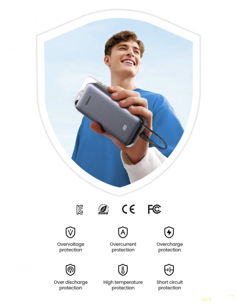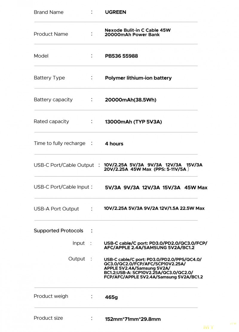 Пауэрбанк UGREEN, может заряжать три устройства одновременно, встроенный кабель USB-C, 45 Вт максимальный выход с порта. Можно брать в самолет (38.5Wh). Масса 465 г.