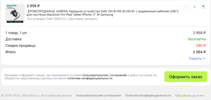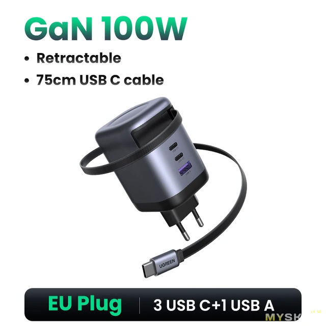 Скидка на Зарядное устройство UGREEN GaN 100 Вт с выдвижным кабелем USB