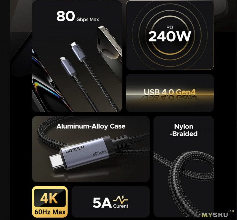 Кабель UGREEN USB C — USB C 240 Вт PD 3.1 Thunderbolt 4 (80 Гбит/с USB4 GEN4) за 931 руб.