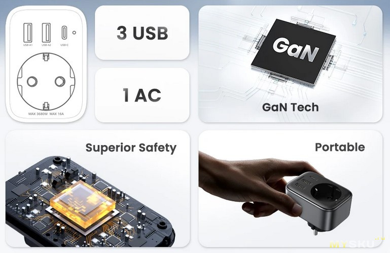 Есть поддержка быстрых протоколов с напряжением вплоть до 20В 1.5А. На все порты суммарно также выдаёт до 30Вт.