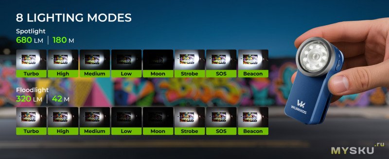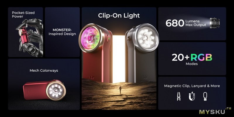 Карманный универсал от Wurkkos. Есть три вида света: фокусированный дальний, рассеянный ближний и RGB с кучей эффектов поиграться или подать красный сигнал. Световой поток до 680 люмен (температура 6000-6500K), клипса и магнит для крепления, 49 г. Управление простое, размеры алюминиевого корпуса 60(д)х28(ш)х25.2(в) мм.