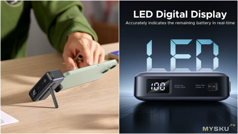 Покупатели отмечают, что устройство удобно носить с собой. Его емкость составляет 5000 мАч. В комплект входит кабель Type-С. В корпусе имеется встроенная подставка, а цифровой индикатор наглядно показывает уровень заряда.