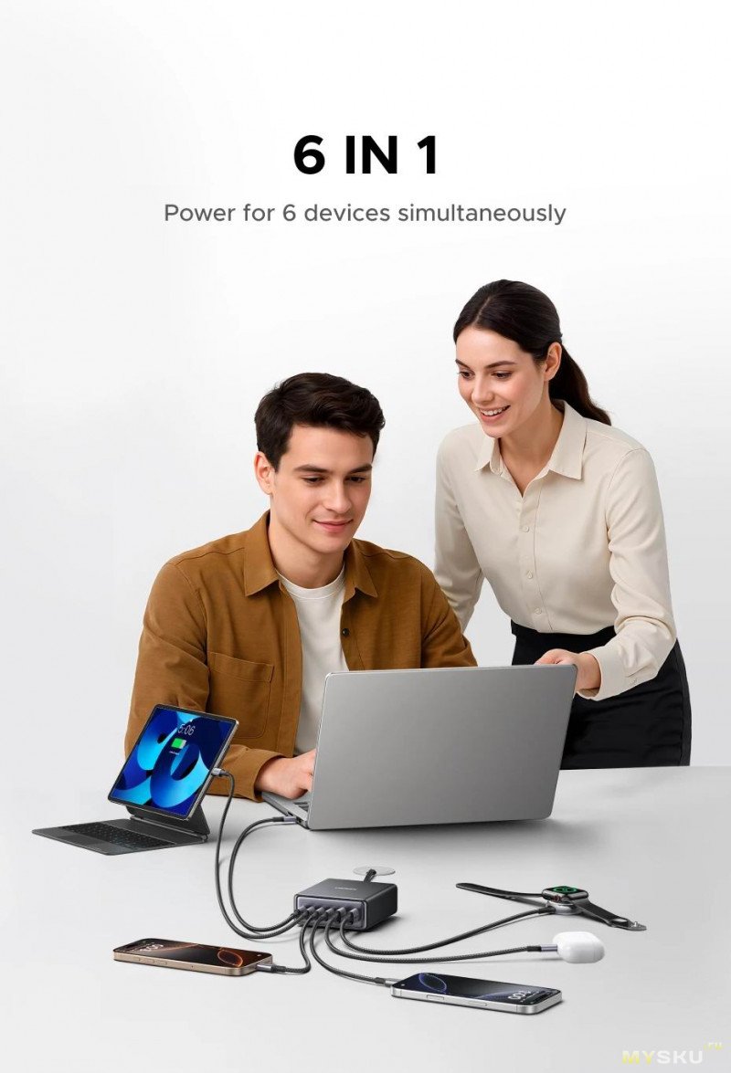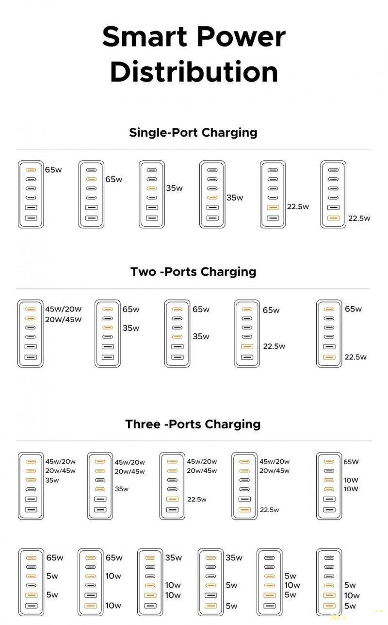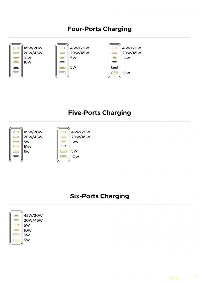 Зарядное устройство имеет 6 портов для одновременной зарядки различных устройств. 4 порта Type-C и 2 порта USB-А. Все порты поддерживают быструю зарядку. Максимальная выходная мощность зарядного устройства составляет 100 Вт.