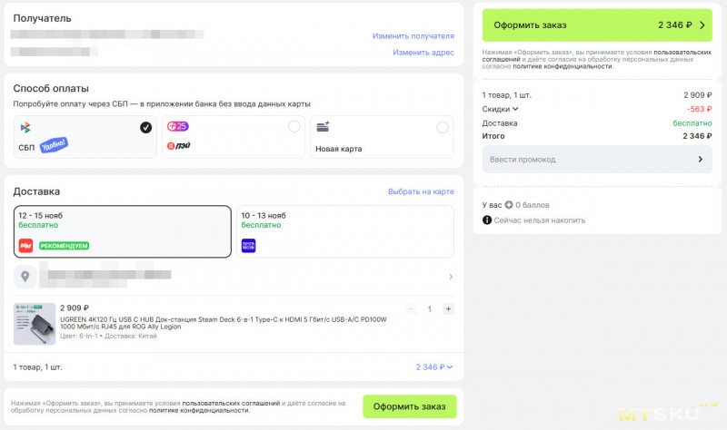 Для указанной цены берем промокод со страницы товара 80₽ от 1531₽ и на этапе оформления заказа вставляем UG11M02. Получается 2346₽ с экспресс-доставкой.