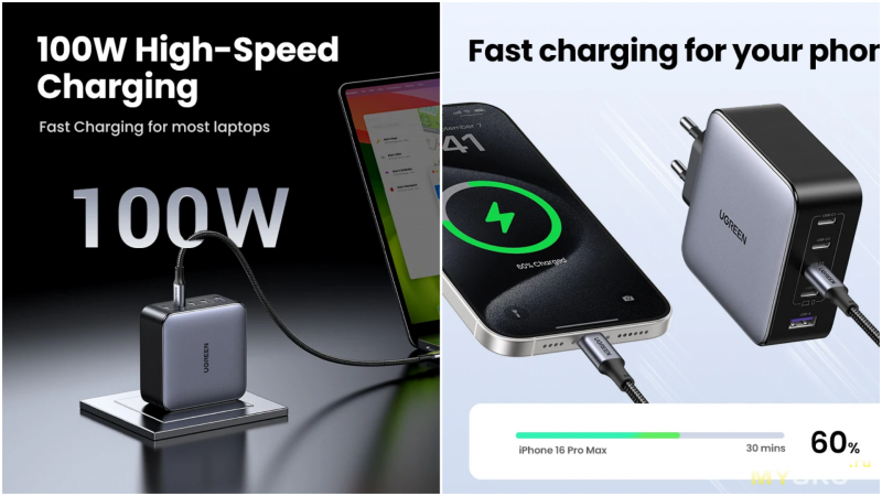 Зарядное устройство UGREEN 100 Вт подходит как для ноутбуков, включая Macbook Air, так и для планшетов и разных смартфонов (заявлена полная совместимость с iPhone 16/15/14 Pro).