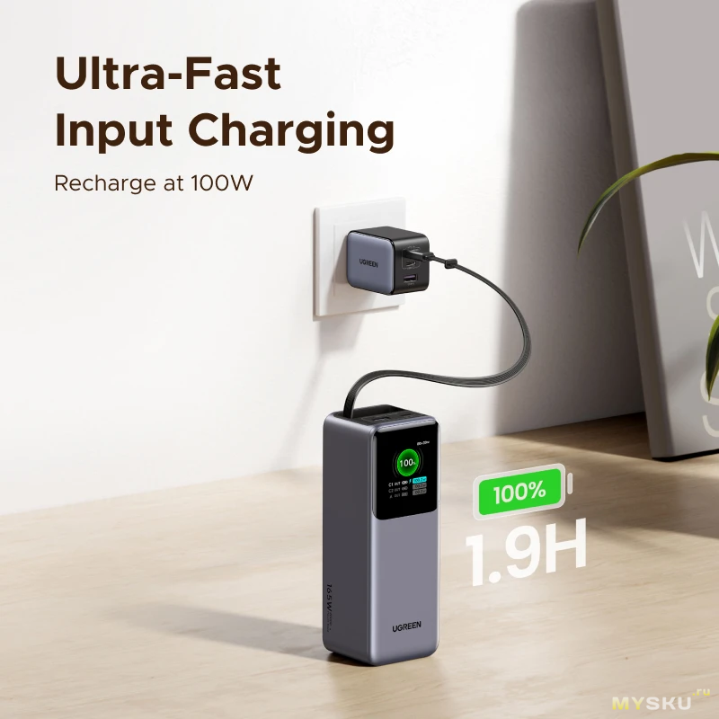 Полный обзор на UGREEN Nexode 165 Вт 20000 мАч был здесь. Если вкратце, то этот павербанк отличается выдвижным USB-C кабелем, способностью одновременной зарядки тр устройств, информативным цветным экраном, а также быстрой зарядкой — до 100% он заряжается всего за 1,9 часа.