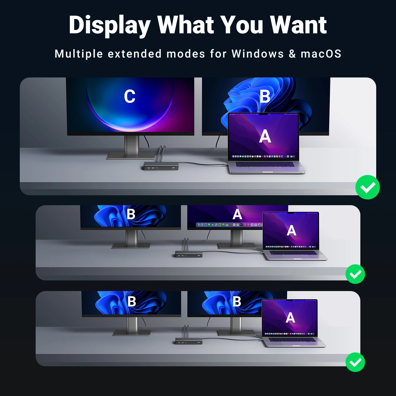 Поддержка технологии DisplayLink в док-станции UGREEN USB-C, которая позволяет подключать два монитора с разрешением 4K@60Hz для систем macOS и Windows.