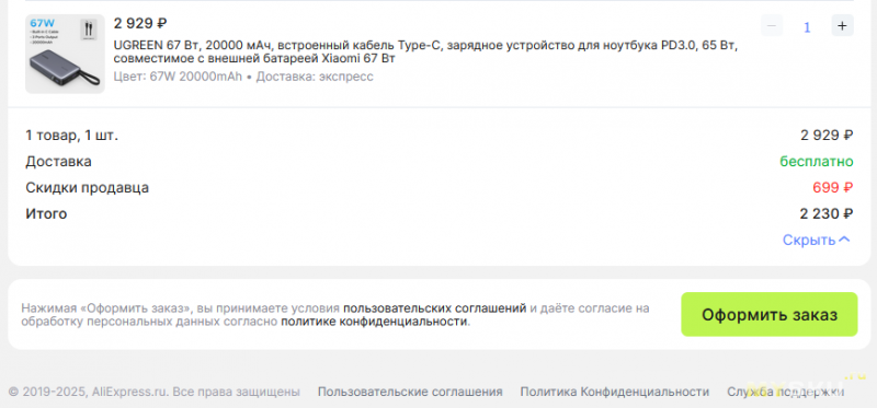 Скидка на Power Bank UGREEN со встроенным кабелем, мощностью 67 Вт, ёмкостью 20000 мАч.